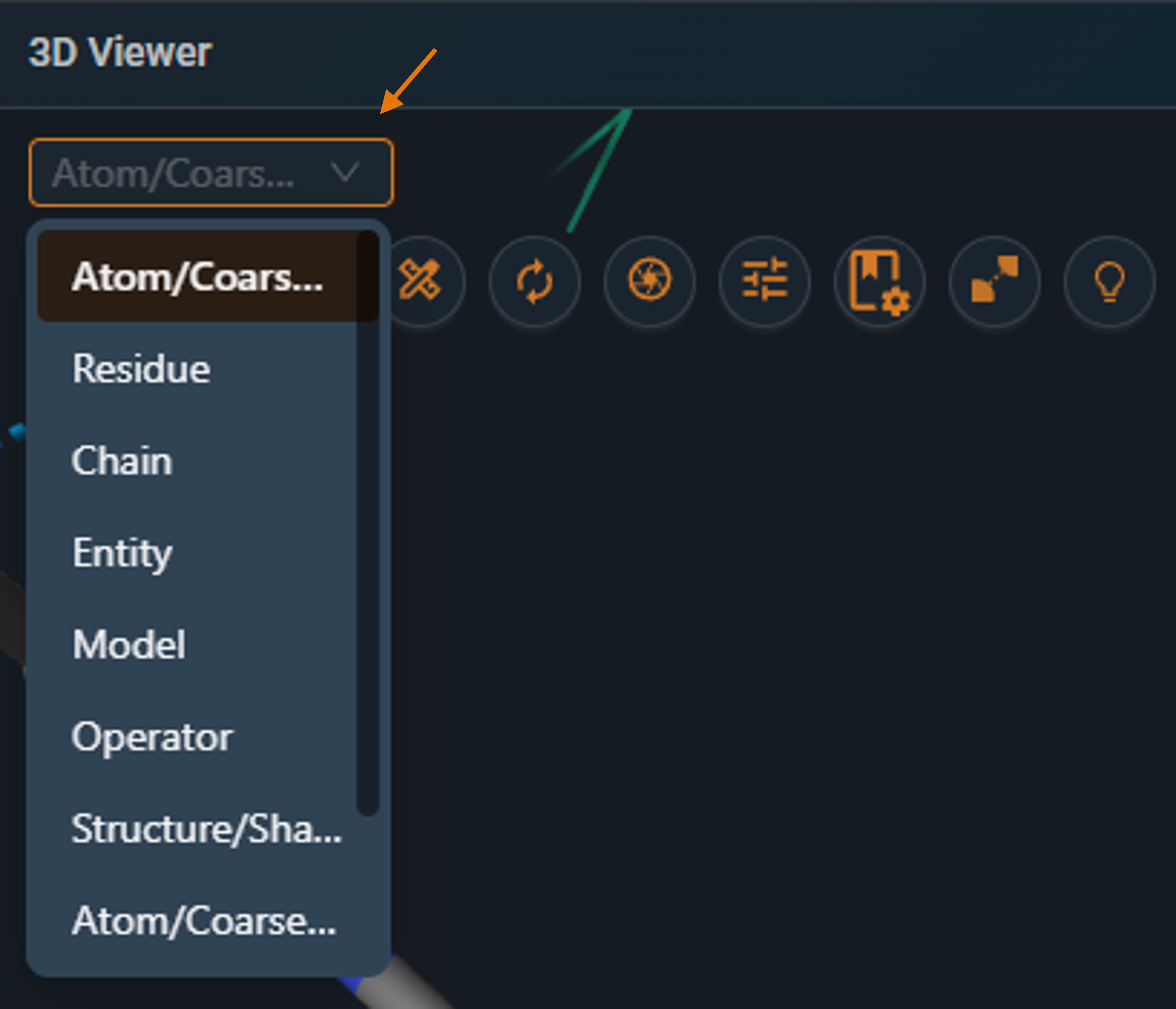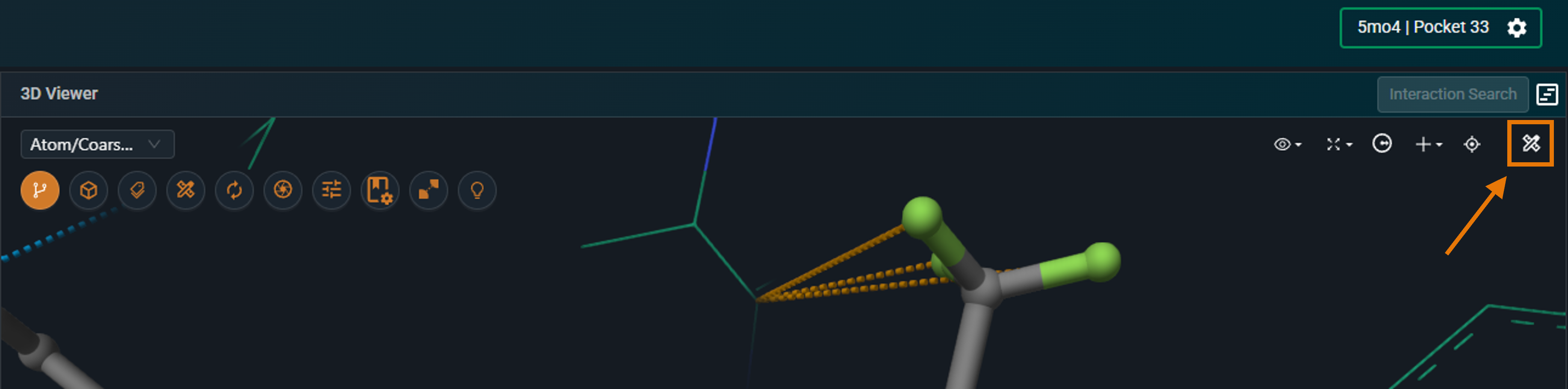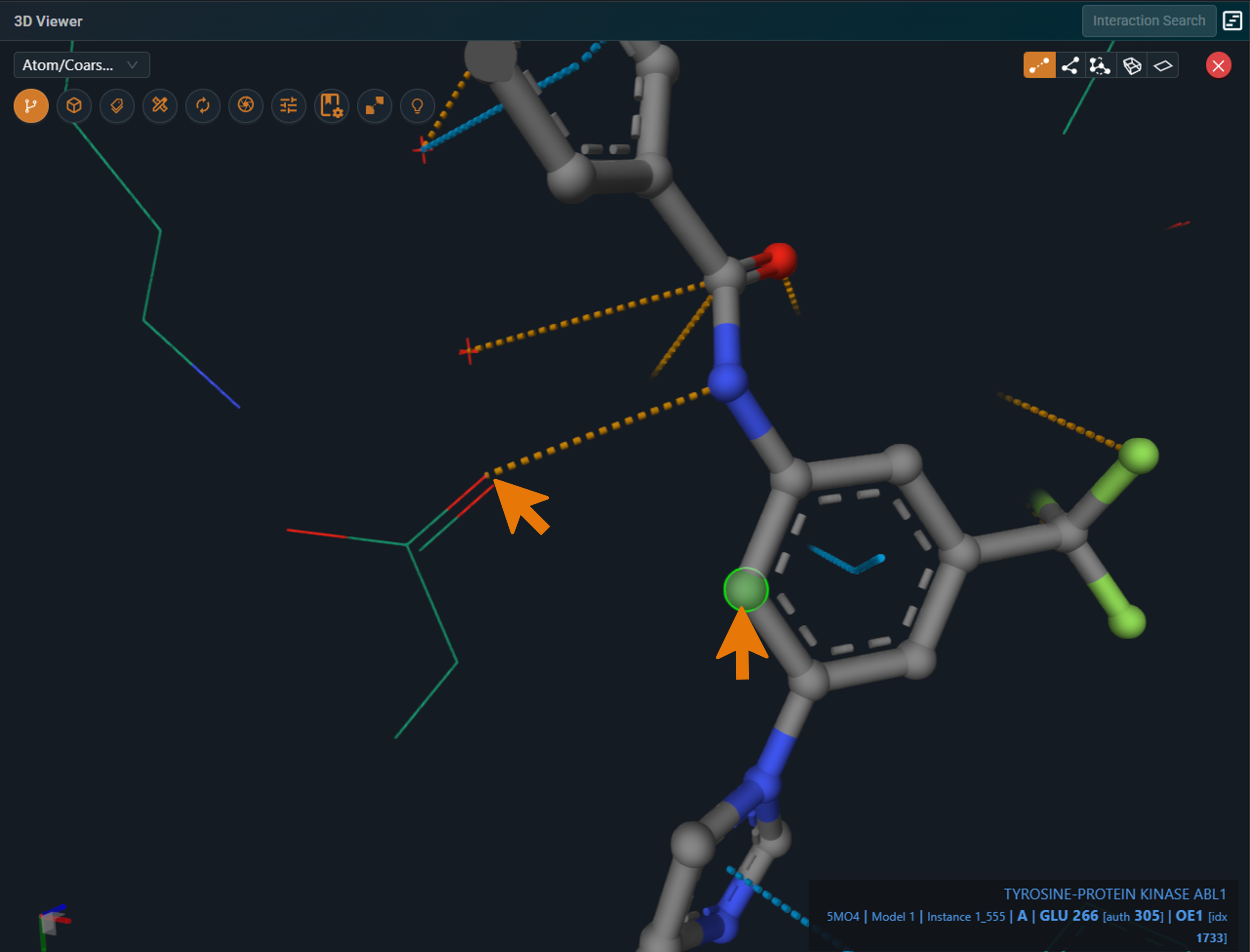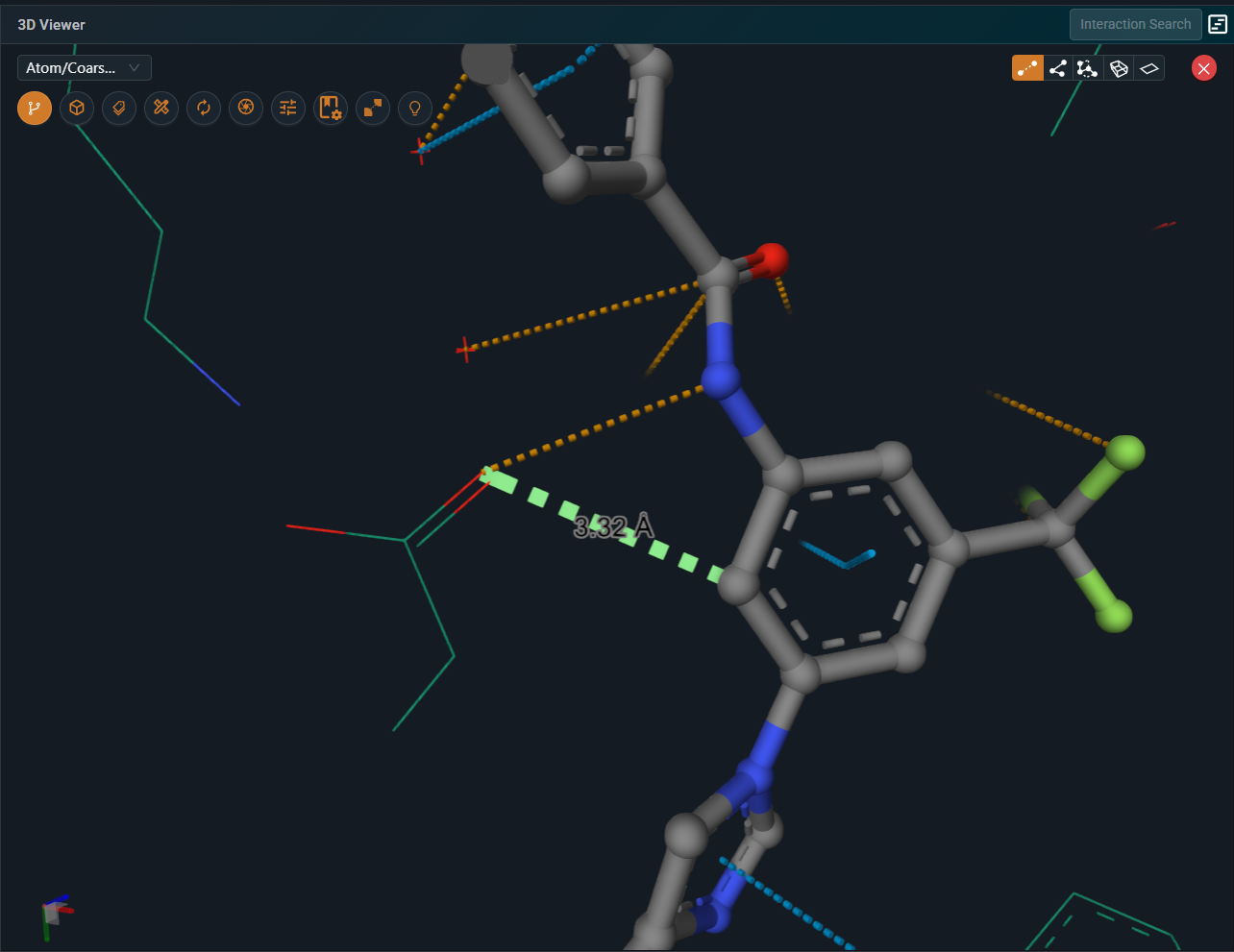 Note: Selecting atoms displayed in line representation can be difficult. For easier selection, switch the representation to ball‑and‑stick.