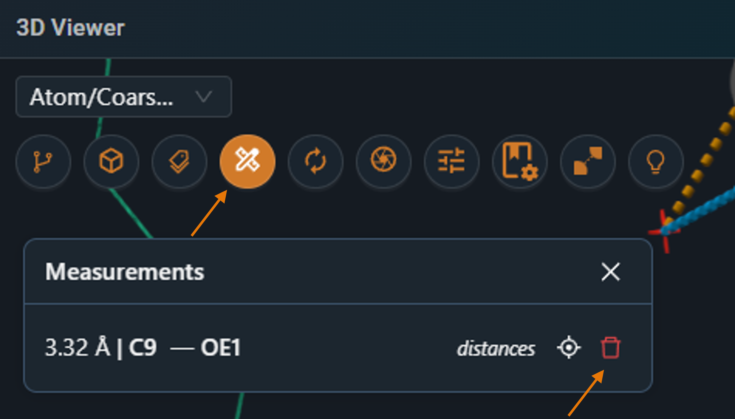The distance is displayed directly in the viewer and also in the Measurements panel on the top left. This is where you can delete the distance if needed.